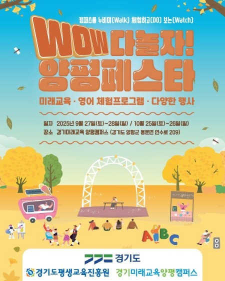 [프레스뉴스] 장현준 기자= 경기도평생교육진흥원 경기미래교육양평캠퍼스는 9월 27~28일, 10월 25~26일 총 두 차례에 걸쳐 ‘WOW 다놀자! 양평페스타’를 개최한다.