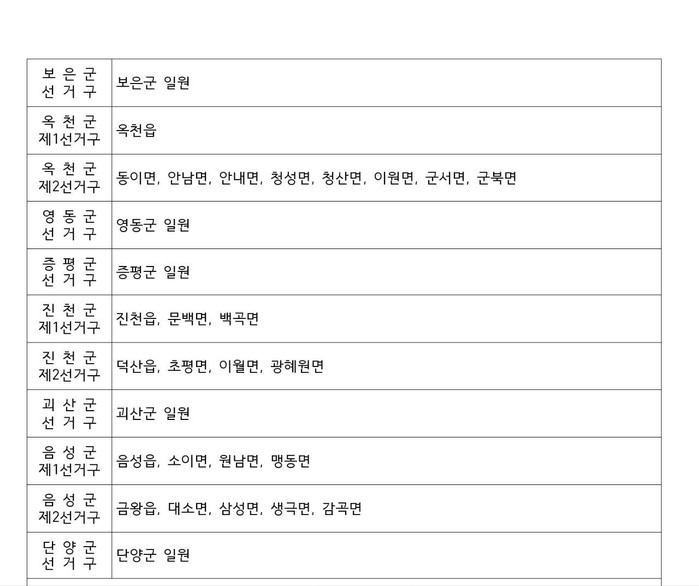 다만 인구감소 등으로 2명이던 영동군 선거구가 1명으로 감소하며 옥천군은 전과동으로 2개 선거구가 유지된다.