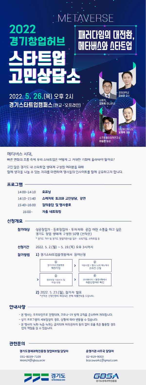 자세한 사항은 경기스타트업플랫폼을 참고하거나 경기도경제과학진흥원 창업허브팀으로 문의하면 된다.