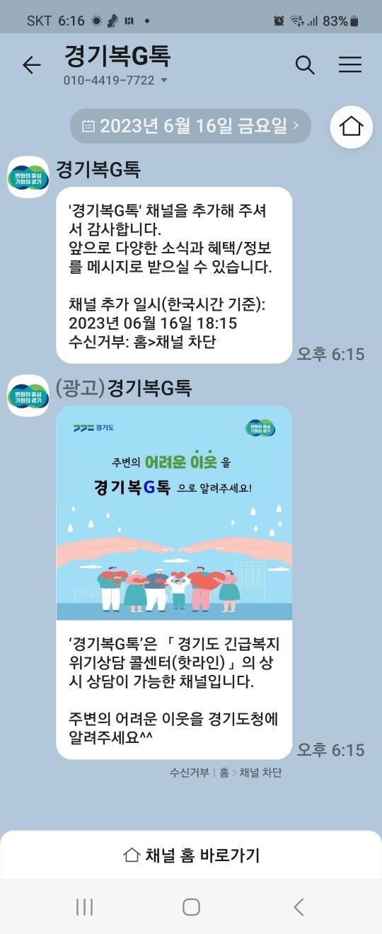 ‘경기복G톡’은 상시 상담이 가능한 카카오 채널이다. 언어장애 등 전화상담이 어려운 대상자를 위해 개설했고, 콜센터 운영시간 외 시간 또는 상담원이 모두 통화 중인 경우를 대비해 예약 상담도 할 수 있다. 카카오톡에서 ‘경기복지’, ‘경기복G톡’ 등을 검색 후 채널 추가하기 버튼을 누르면 이용할 수 있다.