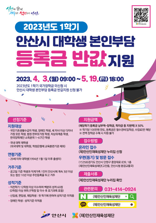 이민근 안산시장은 “금리 인상 등으로 가계 부담이 점차 커지고 있는 시기에 안산시 대학생 본인부담 등록금 반값지원 사업이 경제 부담을 완화해 지역사회 인재 양성에 도움이 되기를 기대한다”고 말했다. 사업과 관련된 자세한 사항은 안산시 또는 안산인재육성재단 누리집(홈페이지)에서 확인하거나 안산인재육성재단을 통해 문의하면 된다.