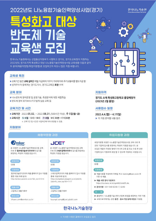 산업통상자원부가 시행하고 경기도와 경기도교육청이 지원하는 ‘나노기술 인력양성사업’은 청년 일자리 창출과 중소기업 현장 기술인력 지원을 목적으로 한국나노기술원이 보유한 첨단설비 및 장비, 전문인력을 활용하여 기술 인력을 양성하는 사업이다. 학생들은 약 5개월 동안 나노 및 반도체 공정 기술 전반에 관한 교육을 받으며 관련 업계 취업 지원도 받을 수 있다.