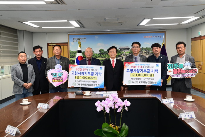 [프레스뉴스] 정호일 기자= (사)한국후계농업경영인 진주시연합회와 순천시연합회, 고흥군연합회는 13일 기업인의 방에서 농업·농촌 지역경제 활성화를 위해 ‘고향사랑기부제 상호 교차 기탁식’을 가졌다.