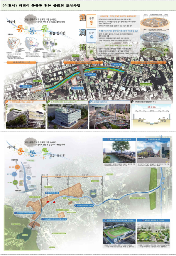 이천시는 이천시 중심 시가지를 흐르는 중리천의 복개 시설을 철거해 치수 안전 확보와 더불어 생물다양성이 살아 숨 쉬는 지역 대표 도심 하천을 만들고자 ‘매력이 통통통 튀는 중리천 조성사업’을 추진할 예정이다.