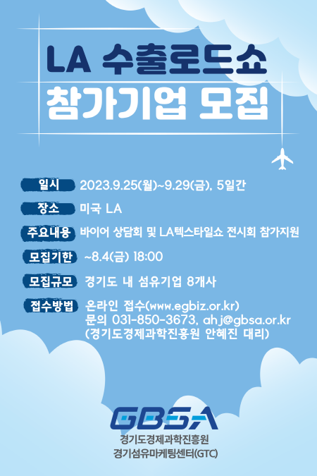 ▲ LA 수출로드쇼 참가기업 모집 홍보 포스터(사진=경기도경제과학진흥원) |