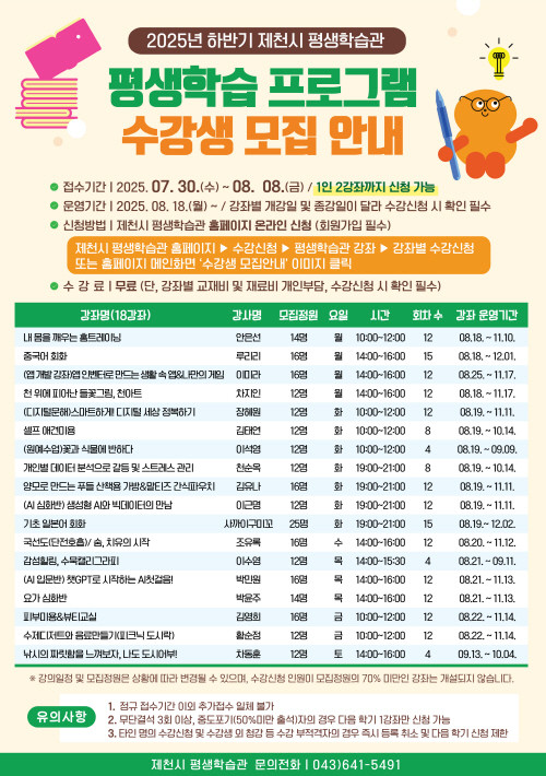 ▲2025년 하반기 제천시 평생학습관, 평생학습 프로그램 수강생 모집 안내 포스터 |