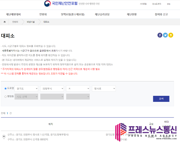 ▲ 국민재난안전포털 대피소 검색 화면 갈무리(사진=경기도북부청) |