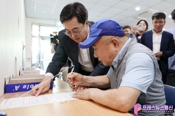 ▲지난 21일 오후 김동연 경기도지사가 원천동 행정복지센터를 방문해 민생회복 소비쿠폰 현장점검 및 건의사항 등을 청취하고 있다.(사진=경기도) |