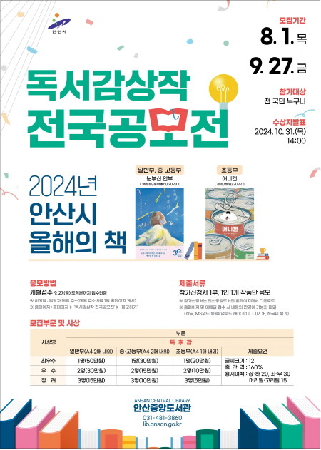 이번 독서 감상작 전국 공모전은 ‘2024 안산시 올해의 책’과 연계한 행사로 독서문화 환경조성을 도모하기 위해 마련됐다.
