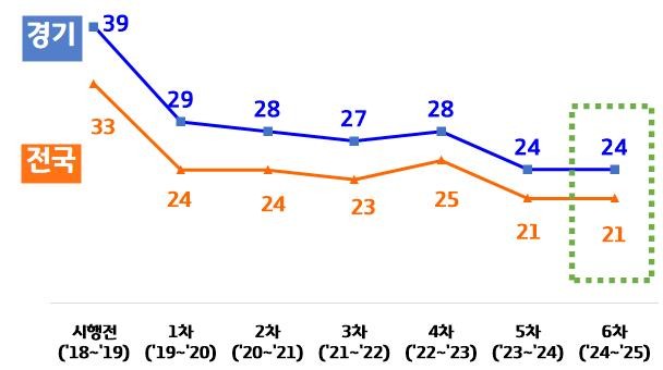 제6차 계절관리제 기간 경기도의 초미세먼지 평균 농도는 24㎍/㎥로, 지난해 제5차와 동일했다. 그러나 ‘좋음’ 일수는 38일에서 47일로 9일 증가해 겨울철 체감 대기질이 개선된 것으로 나타났다.