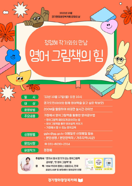 경기도는 ‘경기평화광장 북카페 10월 문화의 날 프로그램’으로 오는 10월 17일(월) 오전 10시부터 <영어 그림책의 힘 : 영어 그림책 공부법>을 개최한다고 12일 밝혔다.