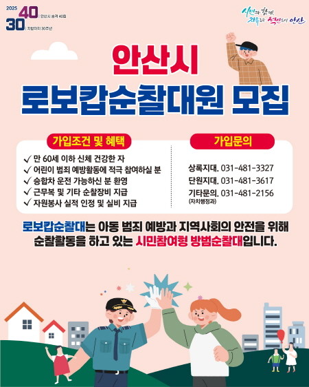 [프레스뉴스] 장현준 기자= 안산시(시장 이민근)는 시민이 직접 참여하는 안전한 지역사회 구축을 위해 ‘로보캅순찰대’ 신규 대원을 연중 상시 모집한다고 24일 밝혔다.