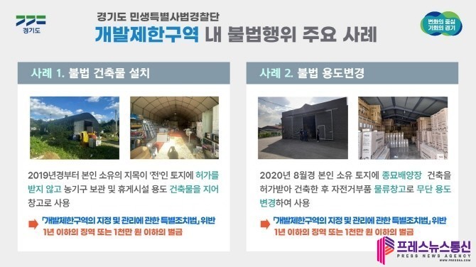 경기도 특사경은 행위자 모두를 형사입건하고, 관할 시군에 행정처분을 의뢰할 예정이며, 개발제한구역 내 불법행위 단속을 내년에도 지속할 예정이다.