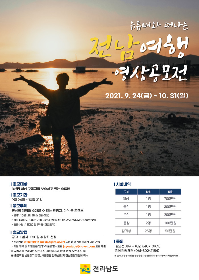 유미자 전남도 관광과장은 “관광 홍보에서 유튜브 등 영상 콘텐츠의 중요성이 점점 커지는 가운데 이번 영상 공모전이 전남의 매력을 다양한 시선으로 발견하는 기회가 될 것”이라며 “공모전에 많은 유튜버가 참여해 전남의 아름다움에 흠뻑 빠질 영상을 제작하길 바란다”고 말했다.