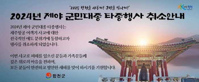| ▲합천군(군수 김윤철)은 31일 밤부터 내달 1일 군민대종각 일원에서 열릴 예정이던 ‘2024년 제야 군민대종 타종행사’를 취소한다고 30일 밝혔다. (사진=합천군) |