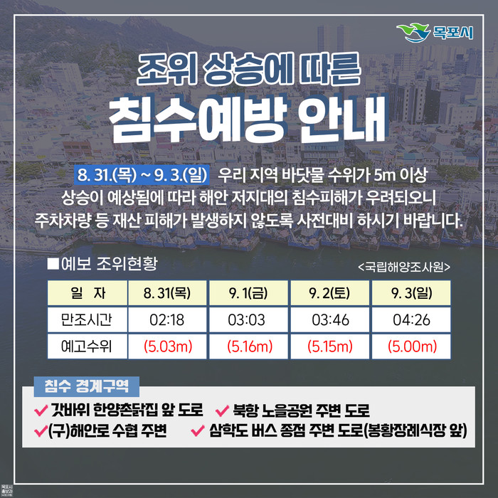 [전남=프레스뉴스] 이광남 기자= 전남 목포시는 대조기인 오는 31일부터 9월 3일(오전 2시 ~ 7시) 사이 바닷물 수위가 5.1m 이상 (조석표상 9/1 최고 5.16m) 상승 예상됨에 따라 피해를 입지 않도록 철저한 대비를 당부했다.