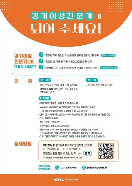 ▲경기 여성전문가DB 신규 등재자 모집 포스터(사진=경기도여성가족재단) |
