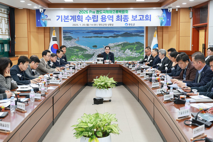 | ▲ 지난 20일 군청 상황실에서 ‘2026 pre 완도국제해조류박람회’ 기본계획 수립 용역 최종 보고회를 개최했다.(사진제공=완도군) |