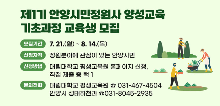 교육은 9월 4일부터 12월 4일까지 매주 목요일 오전 9시부터 오후 1시까지(총 56시간) 대림대 평생교육원에서 진행되며, 정원 분야에 관심 있는 안양시민이면 누구나 신청할 수 있다.