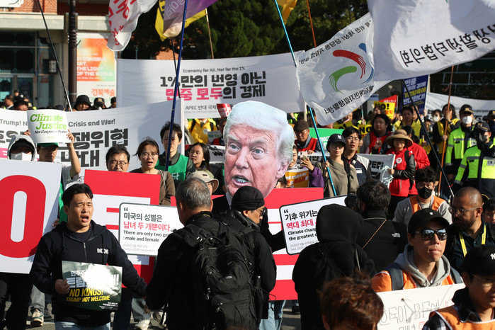 | ▲경북 경주시 성동동 옛 경주역 광장에서 APEC 반대 국제민중행동 조직위원회 관계자들이 집회를 마친 뒤 모형 트럼프를 묶어 '2025 APEC 반대! 트럼프 반대!' 목소리를 높이며 경주 도심을 행진하고 있다. /사진=뉴스1 |