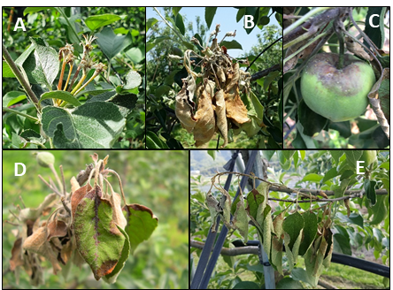 | ▲사과 화상병 부위별 병징 |
