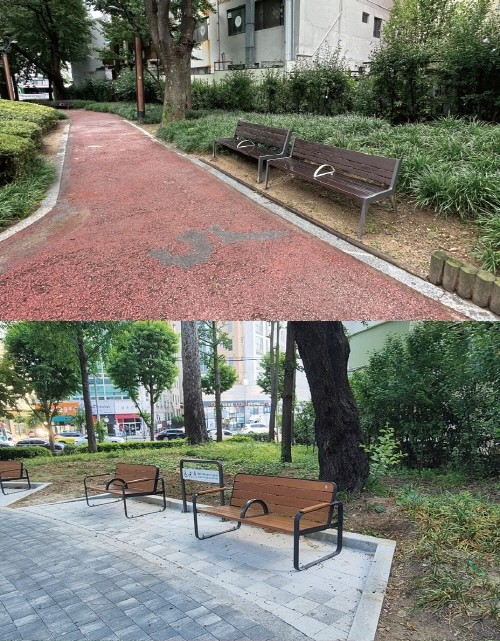 ▲명학공원 유니버설 사업 벤치 전후 비교 사진(사진=안양시) |