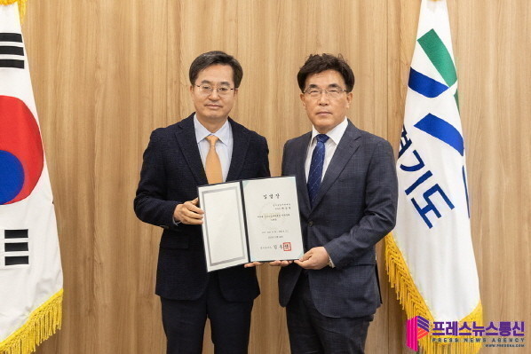| ▲ 26일 오전 경기도청 도지사 집무실에서 김동연 경기도지사가 정동균 경기도시장상권진흥원 이사장에게 임명장을 수여하고 기념촬영을 하고 있다.(사진=경기도) |