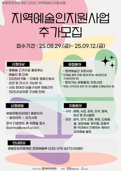 공고 및 접수 기간은 이번달 12일까지이며, 접수는 이메일을 통해 가능하다. 자세한 사항은 (재)영월문화관광재단 누리집 공고문에서 확인할 수 있다.