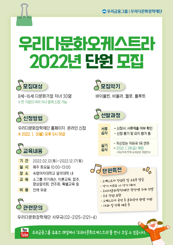[프레스뉴스] 김대일 기자= 우리금융그룹 우리다문화장학재단(이사장 손태승)은‘2022년 우리다문화오케스트라’에 참여할 다문화자녀를 모집한다고 20일 밝혔다.