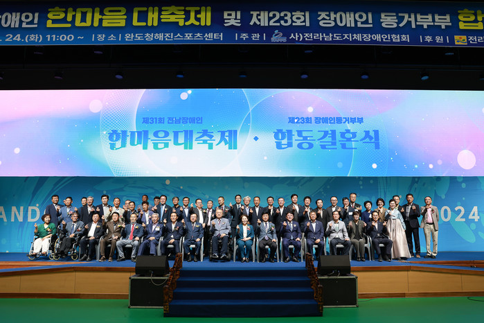 전남도와 완도군이 함께 주최하고 (사)전남지체장애인협회(대표 김종택)가 주관하는 이번 행사는 완도청해진스포츠센터에서 기념식과 합동 결혼식, 어울림 한마당 잔치 등이 진행됐다.