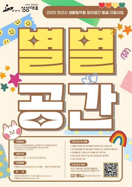 이번 ‘별별공간’ 모집 대상은 안산시 소재의 사업자등록증을 보유한 공간 운영자 가운데 청년(19세~39세)을 대상으로 공간을 제공하거나 프로그램 운영 계획이 있는 자다.