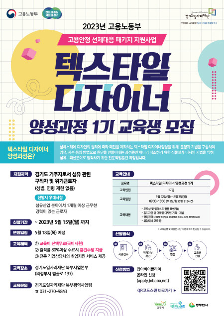▲ 텍스타일 디자이너 양성 과정 1기 교육생 모집 포스터(사진=경기도일자리재단) |