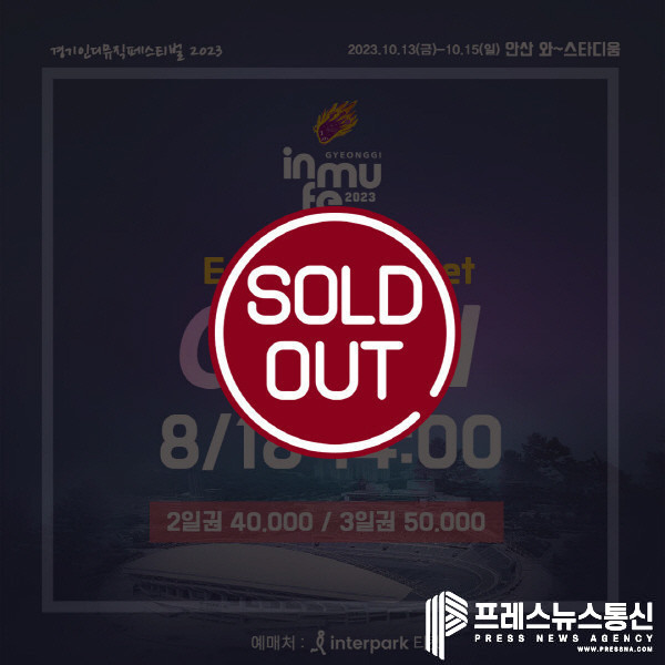 [프레스뉴스] 장현준 기자= 안산시(시장 이민근)는 오는 10월 안산 와∼스타디움에서 열리는 인디뮤지션 최대 축제 ‘2023 경기인디뮤직페스티벌’ 얼리버드 티켓이 음악 팬들의 열띤 관심 속에 판매 3시간 만에 전권 매진됐다고 22일 밝혔다.