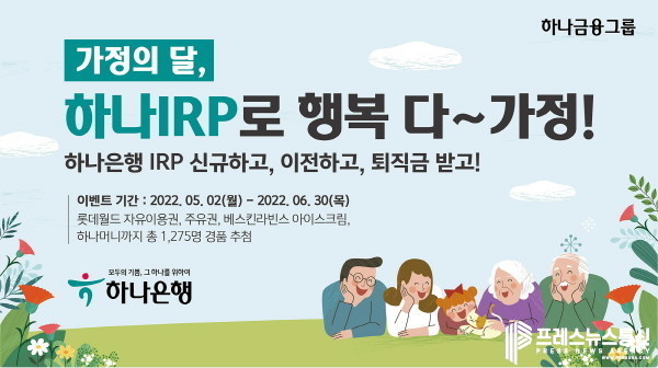 [프레스뉴스] 김대일 기자= 하나은행(은행장 박성호)은 5월 가정의 달을 맞이하여, 개인형 퇴직연금 (IRP) 손님을 대상으로 『하나 IRP로 행복 다~가정! 이벤트』 를 진행 한다고 밝혔다.