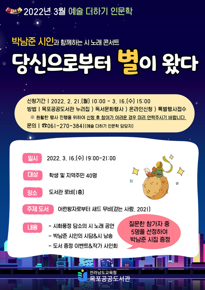 [전남=프레스뉴스] 강래성 기자= 목포공공도서관(관장 오준경)은 오는 3월 16일(수) 저녁 7시에 목포시민과 청소년을 위해 3월 예술 더하기 인문학 행사인「박남준 시인과 함께하는 시 노래 콘서트」를 운영한다.