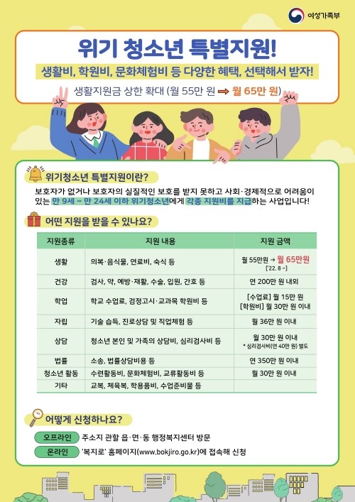만 9~24세 위기청소년 대상 사회, 경제적 지원금 지원 가능