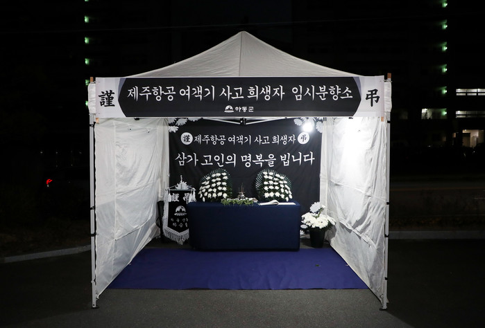 [프레스뉴스] 정재학 기자=하동군이 29일 발생한 제주항공 여객기 사고 희생자를 추모하기 위해 군청 민원과 측면 주차장에 합동 분향소를 마련했다.