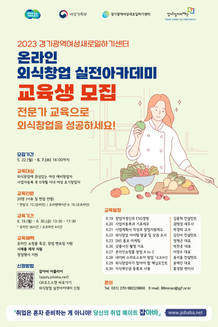 [프레스뉴스] 김대일 기자= 경기도일자리재단내 경기광역여성새로일하기센터가 여성들의 성공적인 외식 창업을 지원하기 위한 ‘온라인 외식창업 실전아카데미’ 교육생을 모집한다.