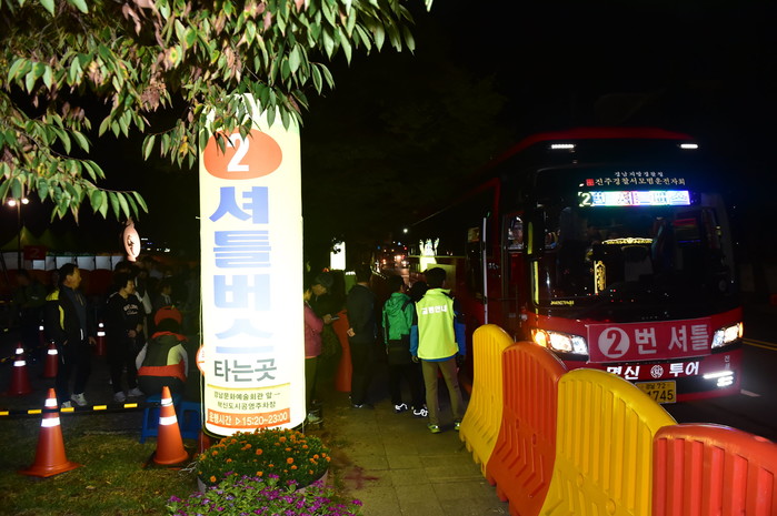 진주시민들은 자가용보다는 ‘축제장 가는 버스’ 안내문이 부착된 시내버스를 이용하면 축제장소로 이동이 훨씬 용이하며, 승용차로 방문하는 외지 관광객들은 시 외곽에 조성된 임시주차장에 차량을 주차한 후 셔틀버스를 이용하면 좀 더 편리하게 축제를 즐길 수 있다.