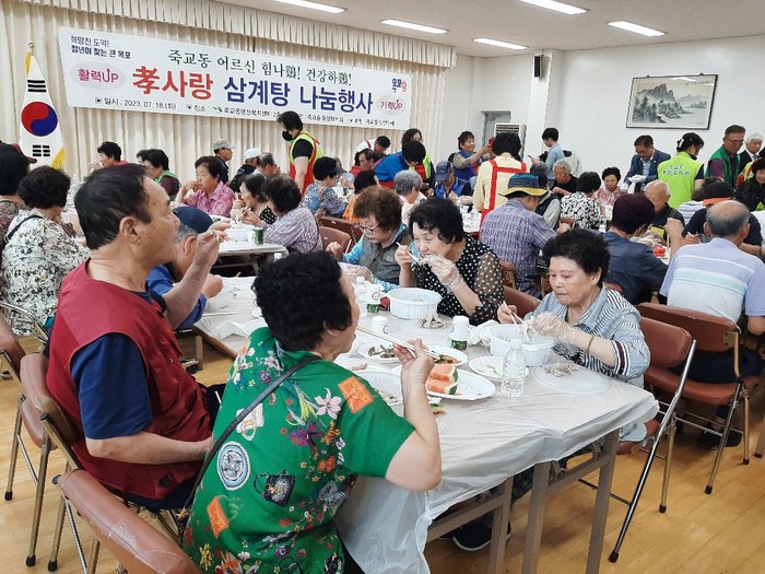 [전남=프레스뉴스] 이광남 기자= 죽교동 통장협의회(회장 윤연심)가 홀로 사는 어르신 100여명을 초청해 동 행정복지센터에서 삼계탕 나눔 행사를 진행했다.