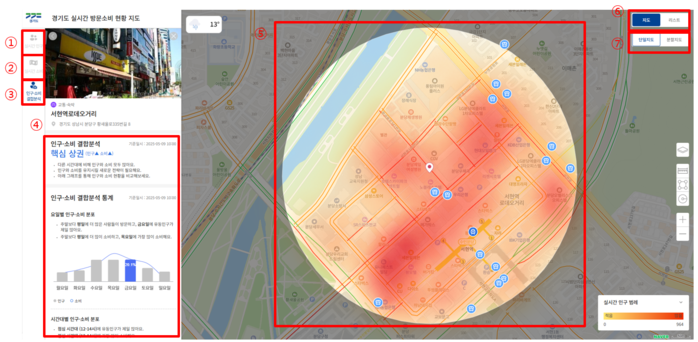 ‘실시간 방문소비 현황지도’는 경기도 주요 지역의 5분 단위 인구 밀집도와 1시간 단위 소비 데이터를 지도 기반으로 시각화해 제공한다. 현재 어느 지역에 인구가 집중돼 있는지, 어떤 업종에서 소비가 활발한지를 확인할 수 있어, 나들이·이동 경로 조정이나 행사 밀집도 관리, 상권 분석 등에 유용하다. 단, 데이터 처리 시간으로 인해 실시간 인구는 15분, 소비 데이터는 30분 지연된 정보를 제공한다.