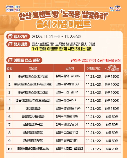 | ▲안산 브랜드빵 '노적봉 별빛츄리' 1+1 이벤트 업소 현황 안내 포스터(사진=안산시) |