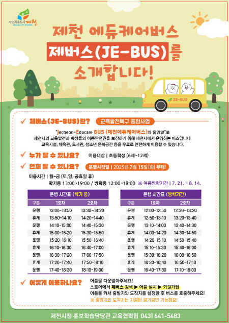 15일 시에 따르면 ‘제버스’는 제천에듀케어버스(Jecheon-Educare BUS)의 줄임말로, 초등학생의 방과 후 이동을 지원하는 수요응답형 버스다. 도서관, 청소년시설, 체육시설, 문화공간 등 지역 내 다양한 교육·돌봄시설을 연결하여, 학생들의 편리하고 안전한 이동을 지원할 예정이다.