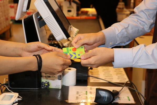 | ▲관내 한 마트에서 향수OK 카드로 결제하고 있다.(사진=옥천군) |