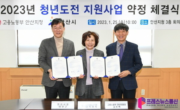 이날 안산시와 고용노동부 안산지청(지청장 김주택)은 지청 회의실에서 ‘2023년 청년도전 지원사업 약정 체결식’을 열고 청년 취업 지원을 위해 함께 노력하기로 뜻을 모았다.