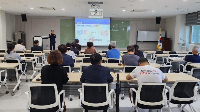 농학박사인 손영걸 진주지속협 공동의장이 농민 40여 명을 대상으로 정확한 농기계 작동법 및 사고 예방 수칙 등 최근 발생한 농기계 관련 사고 사례를 들어 교육을 진행했다.