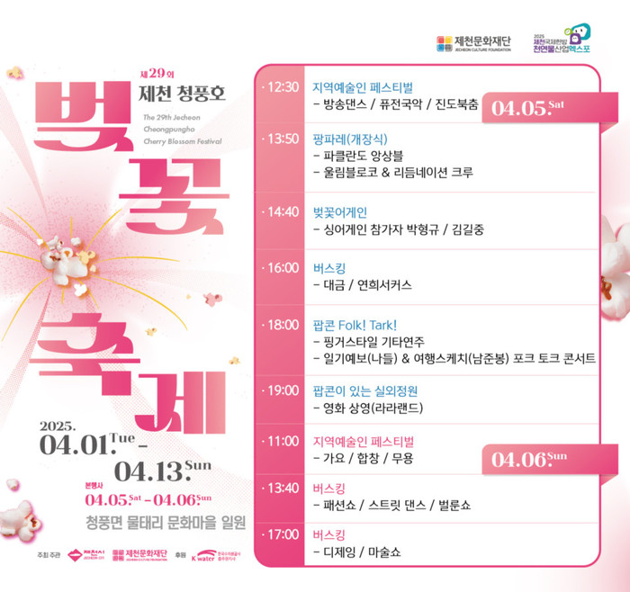 시 관계자는 “청풍호 벚꽃축제는 제천의 자연경관과 지역문화가 어우러지는 대표적인 봄 축제”라며 “많은 분들이 오셔서 청풍호의 아름다움과 봄의 향기을 함께 느끼시길 바란다”고 말했다.