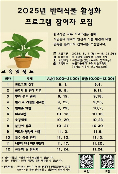[프레스뉴스] 장현준 기자= 시흥시(시장 임병택)는 8월 25일까지 ‘2025년 반려식물 활성화 프로그램’ 참가자를 모집한다.