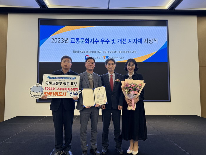 진주시는 지난 1월 국토교통부에서 발표한 2023년 교통문화지수 순위에서 인구 30만 이상 시 그룹에서 전국 1위를 차지해, 2일 코트야드 바이 메리어트 세종에서 열린 ‘2023년 교통문화지수 실태조사 우수지자체 시상식’에서 국토교통부 장관상을 수상했다고 밝혔다.