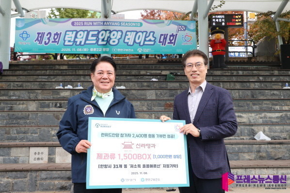 | ▲(주)신라명과는 런위드 안양 시즌10 온기런109 미션 성공을 축하하며 1000만원 상당의 제과를 저소득 홀몸 어르신에게 후원했다.(사진=안양시) |